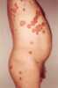 Psoriasis is a long-lasting, noncontagious autoimmune disease characterized by raised areas of abnormal skin. These areas are typically red, or purple on some people with darker skin, dry, itchy, and scaly. [Source: Wikipedia ]