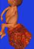A teratoma is a tumor made up of several different types of tissue, such as hair, muscle, teeth, or bone. Teratoma typically form in the ovary, testicle, or coccyx. [Source: Wikipedia ]