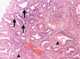 Cystitis cystica is a rare chronic reactive inflammatory disorder thought to be caused by chronic irritation of the urothelium because of infection, calculi, outlet obstruction, or tumor resulting in multiple small filling defects in the bladder wall. [Source: Wikipedia ]